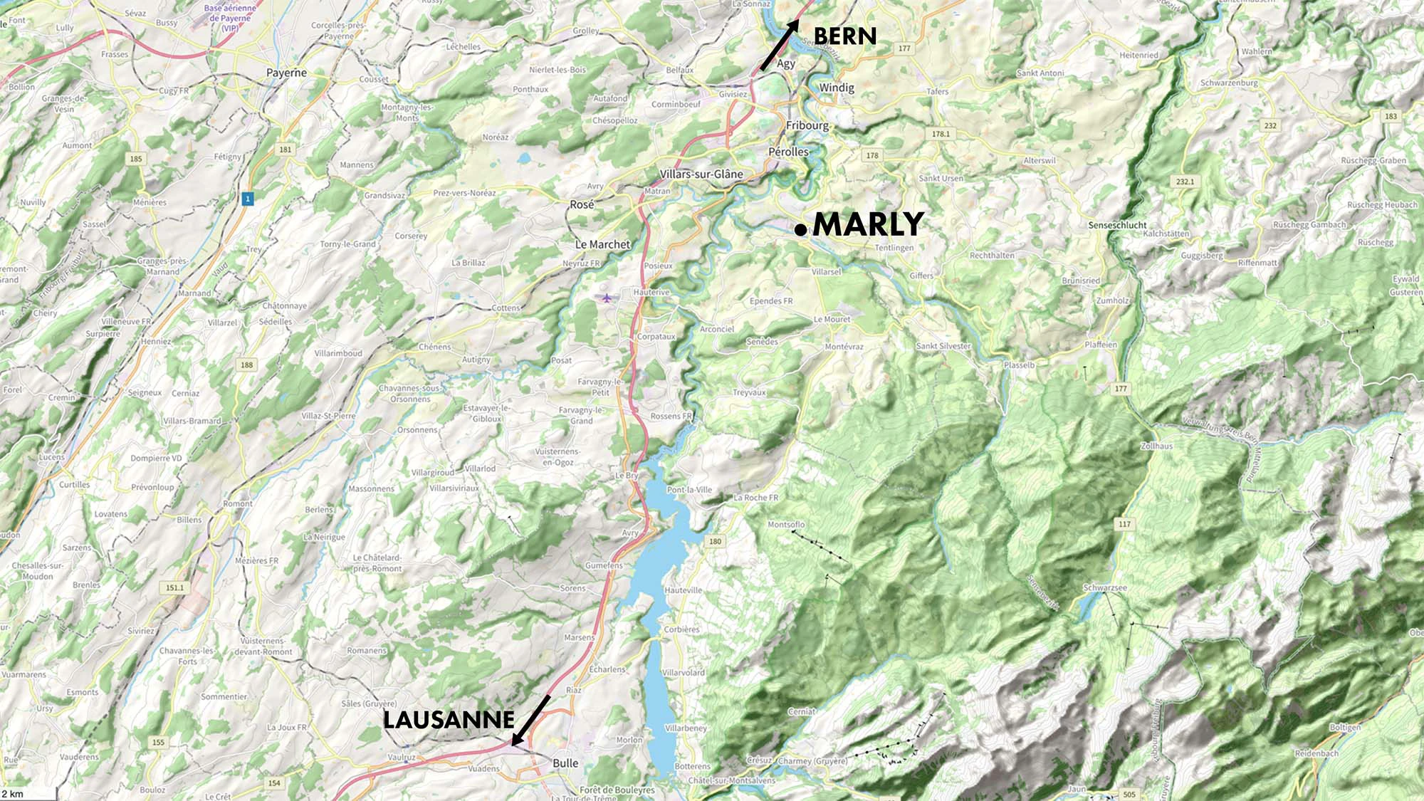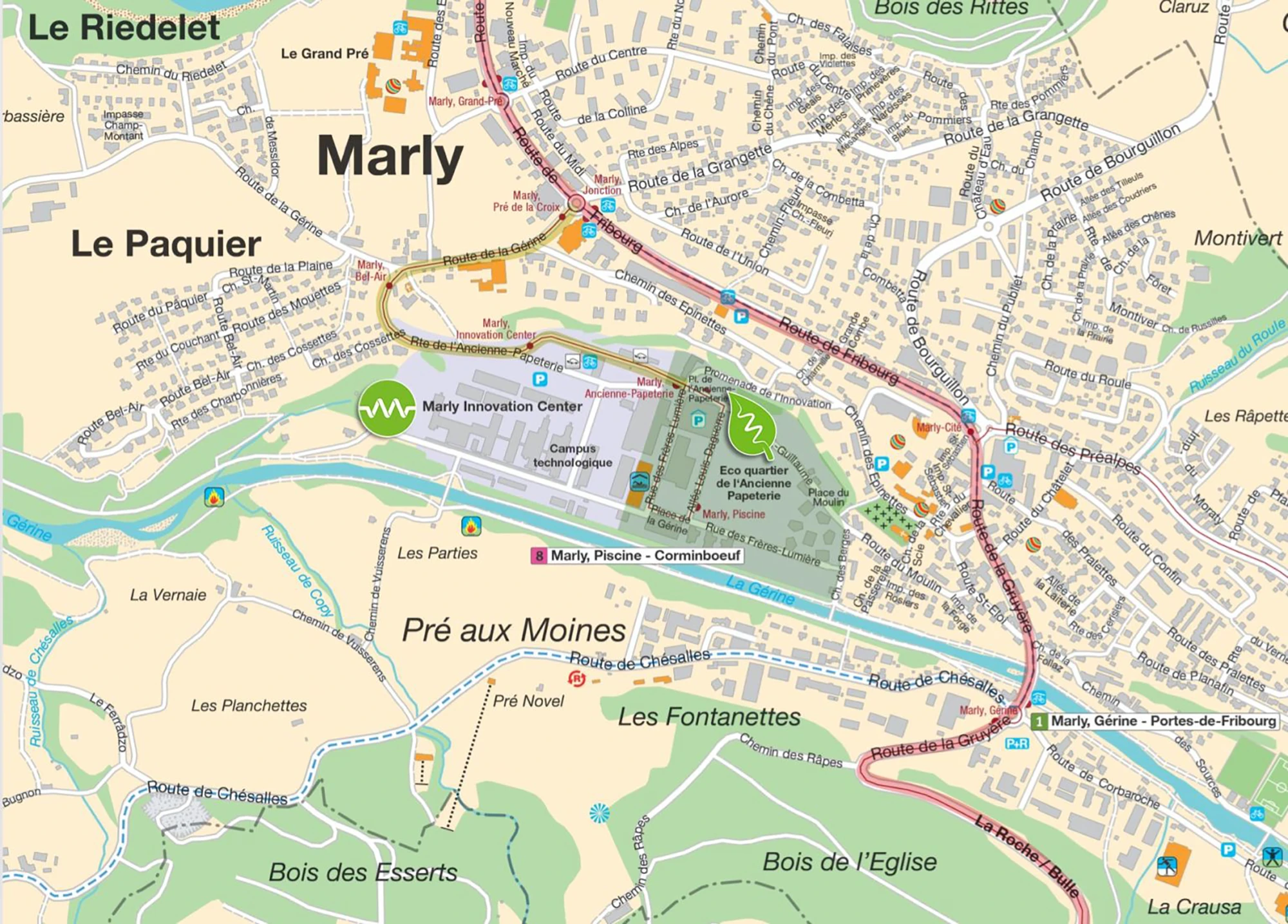 La ligne TPF n°8 (Corminbœuf - Marly, Piscine) dessert trois arrêts sur le site du MIC, et ce, tous les quarts d’heure. Depuis la gare de Fribourg, vous rejoindrez l’écoquartier en seulement 12 minutes.