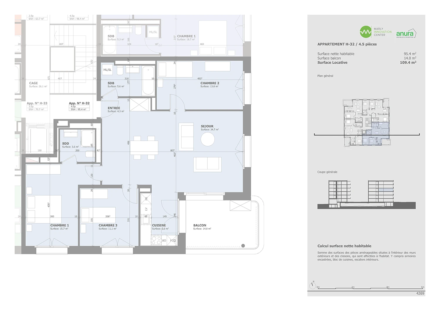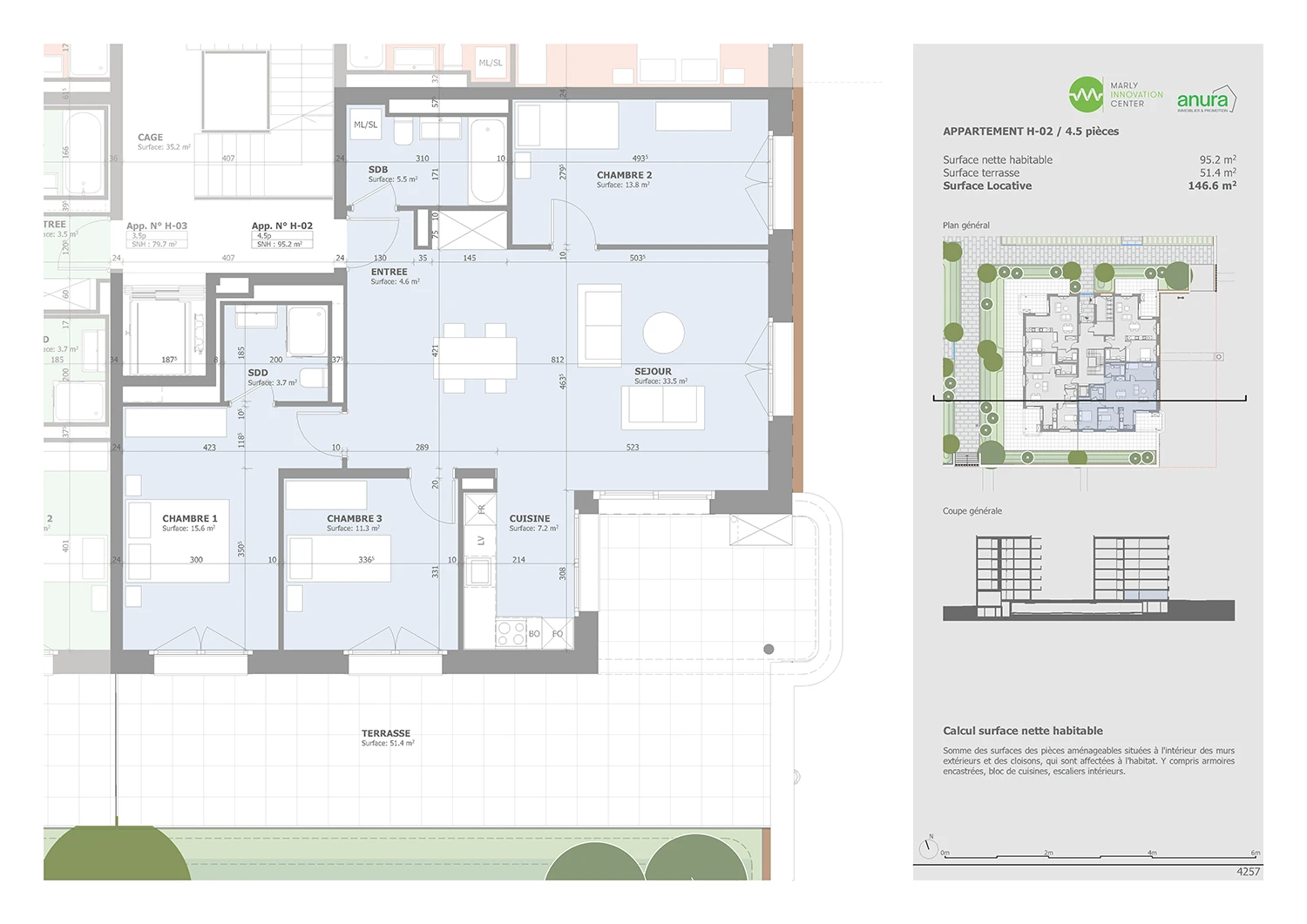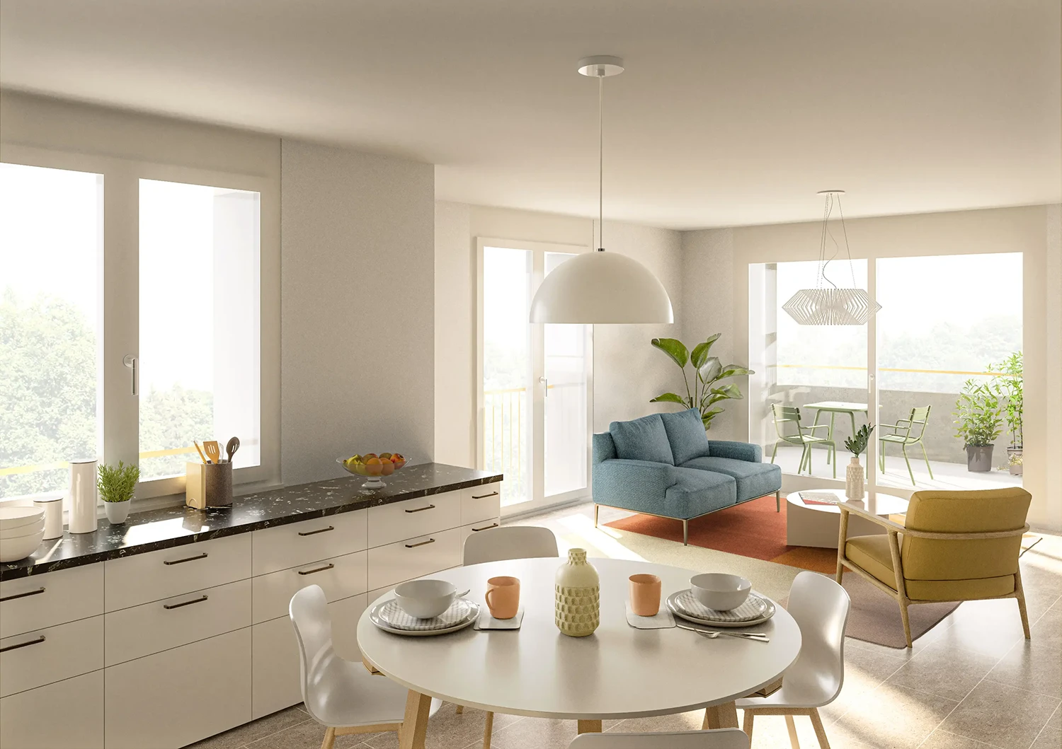 Chaque logement est équipé de la ventilation double flux, de stores électriques, de fenêtres à triple vitrage, d’une colonne de lavage/séchage, ainsi que d’armoires de rangement à l’entrée et sur les balcons. Les cuisines ouvertes sur la pièce de vie sont entièrement équipées d’appareils électroménagers au plus haut rendement énergétique.