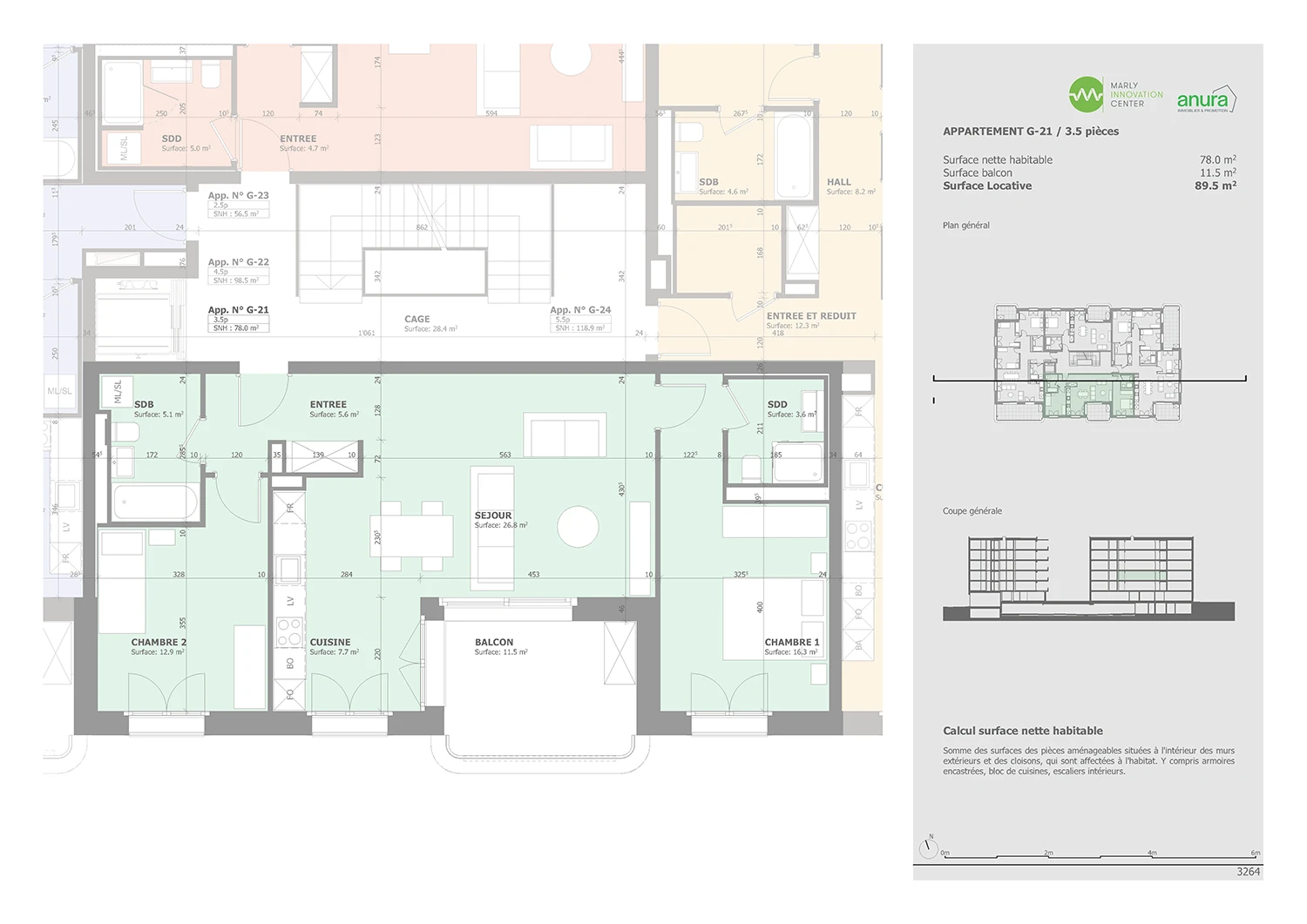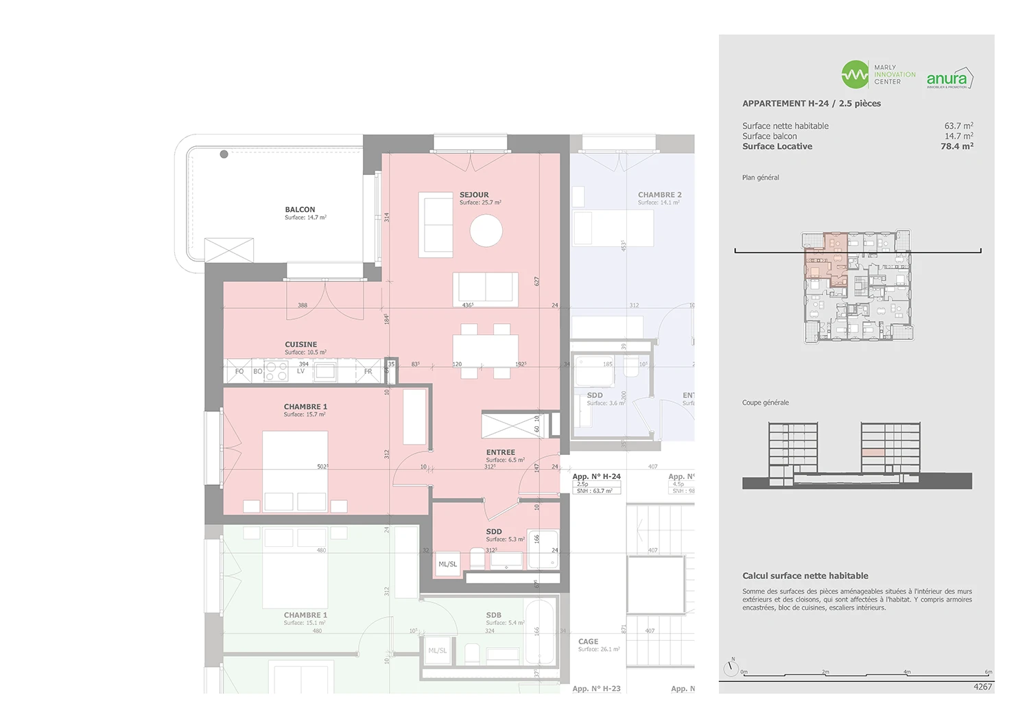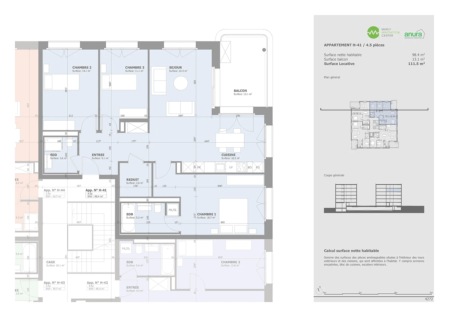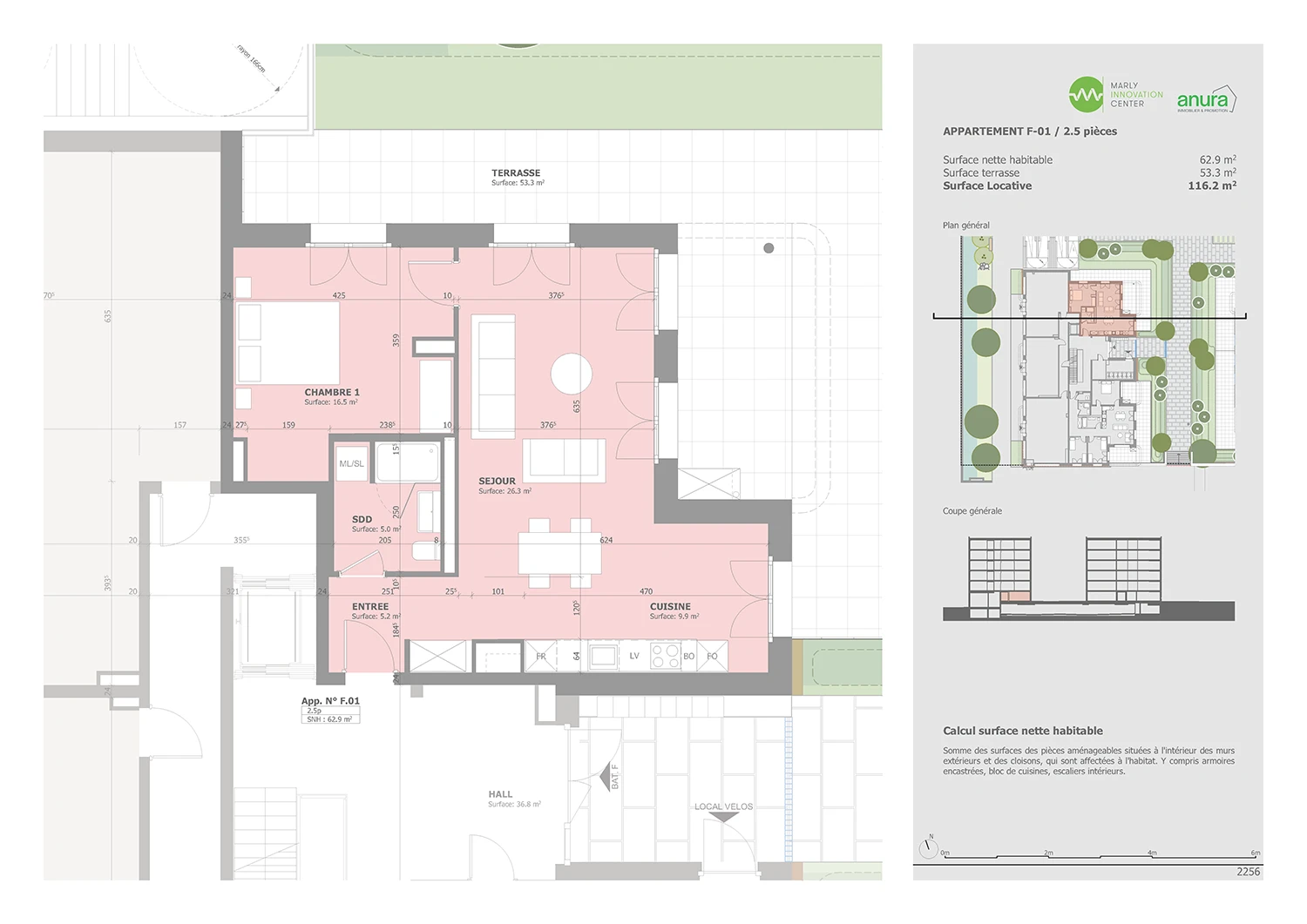 Chaque logement est équipé de la ventilation double flux, de stores électriques, de fenêtres à triple vitrage, d’une colonne de lavage/séchage, ainsi que d’armoires de rangement à l’entrée et sur les balcons. Les cuisines ouvertes sur la pièce de vie sont entièrement équipées d’appareils électroménagers au plus haut rendement énergétique.