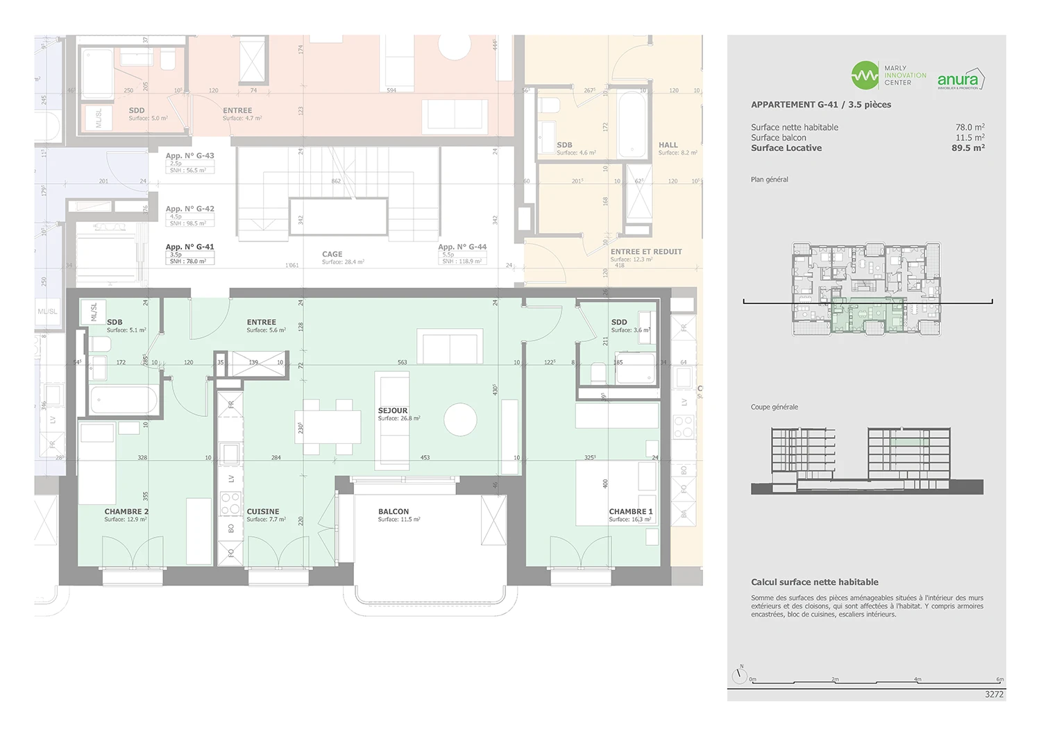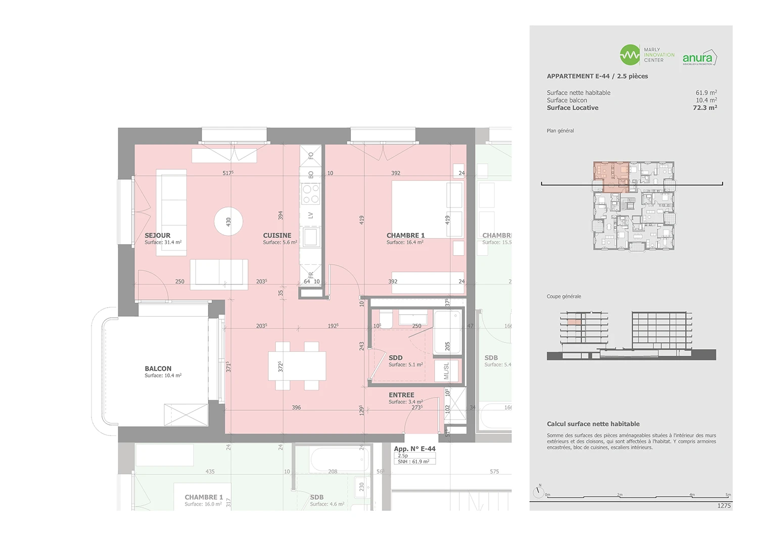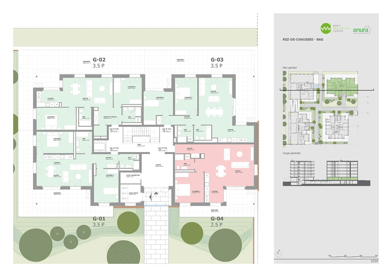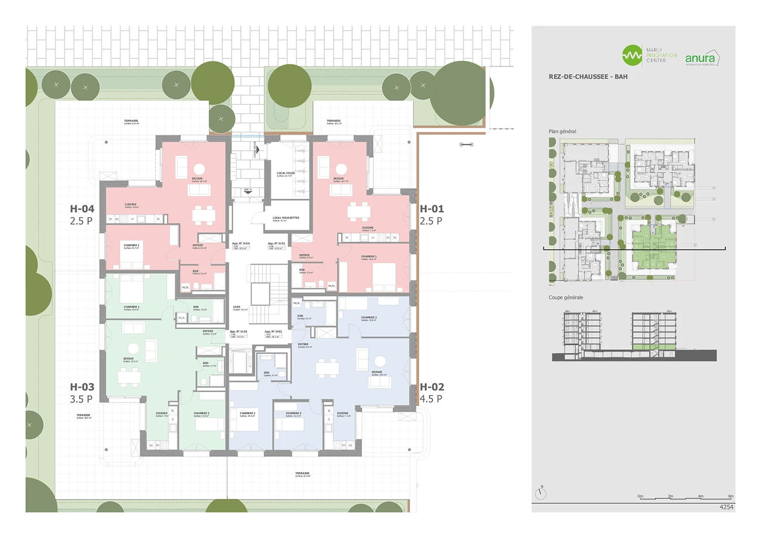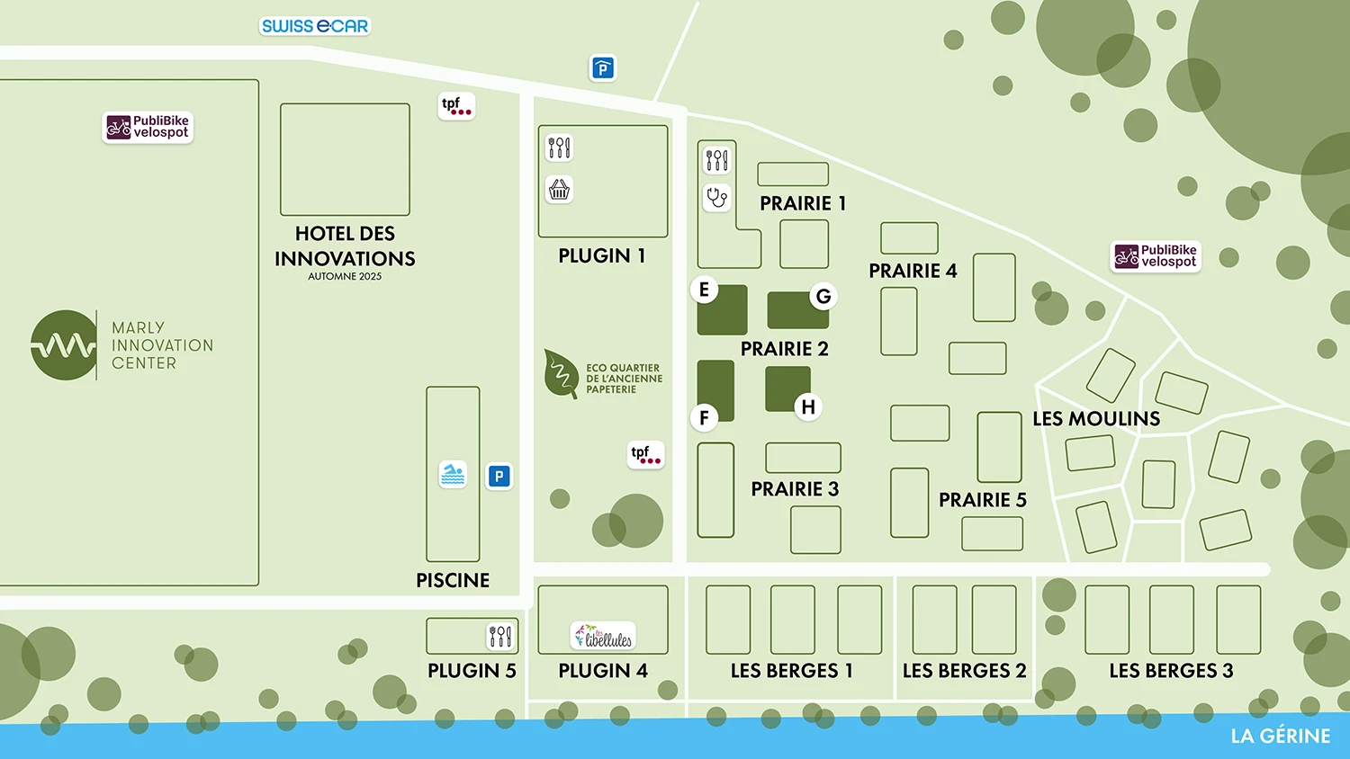 Les bâtiments E-F-G-H totalisent 96 logements à louer, répartis selon les typologies suivantes : 2.5, 3.5, 4.5 et 5.5 pièces. Certains appartements disposent d’un réduit, afin d’optimiser le rangement.