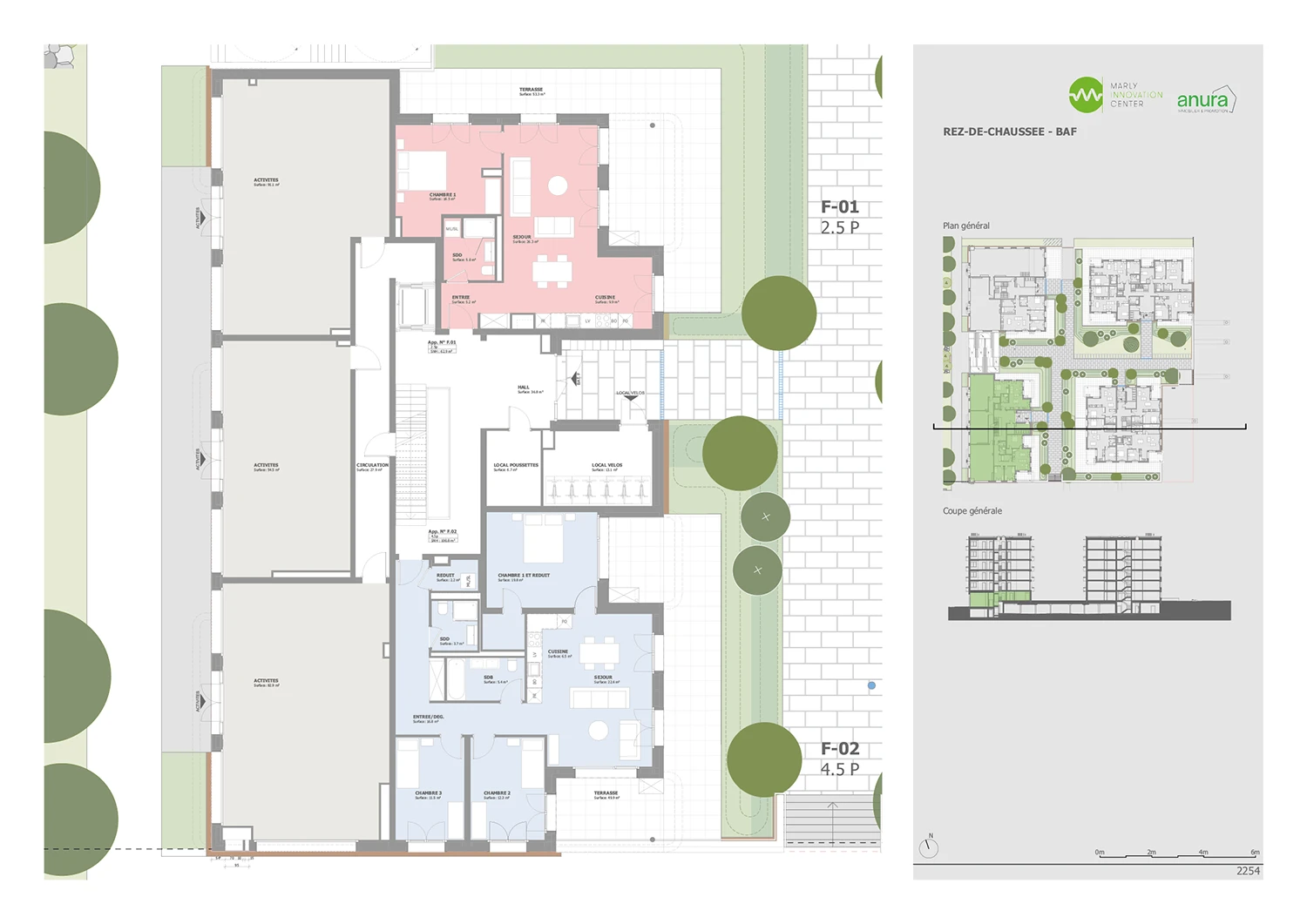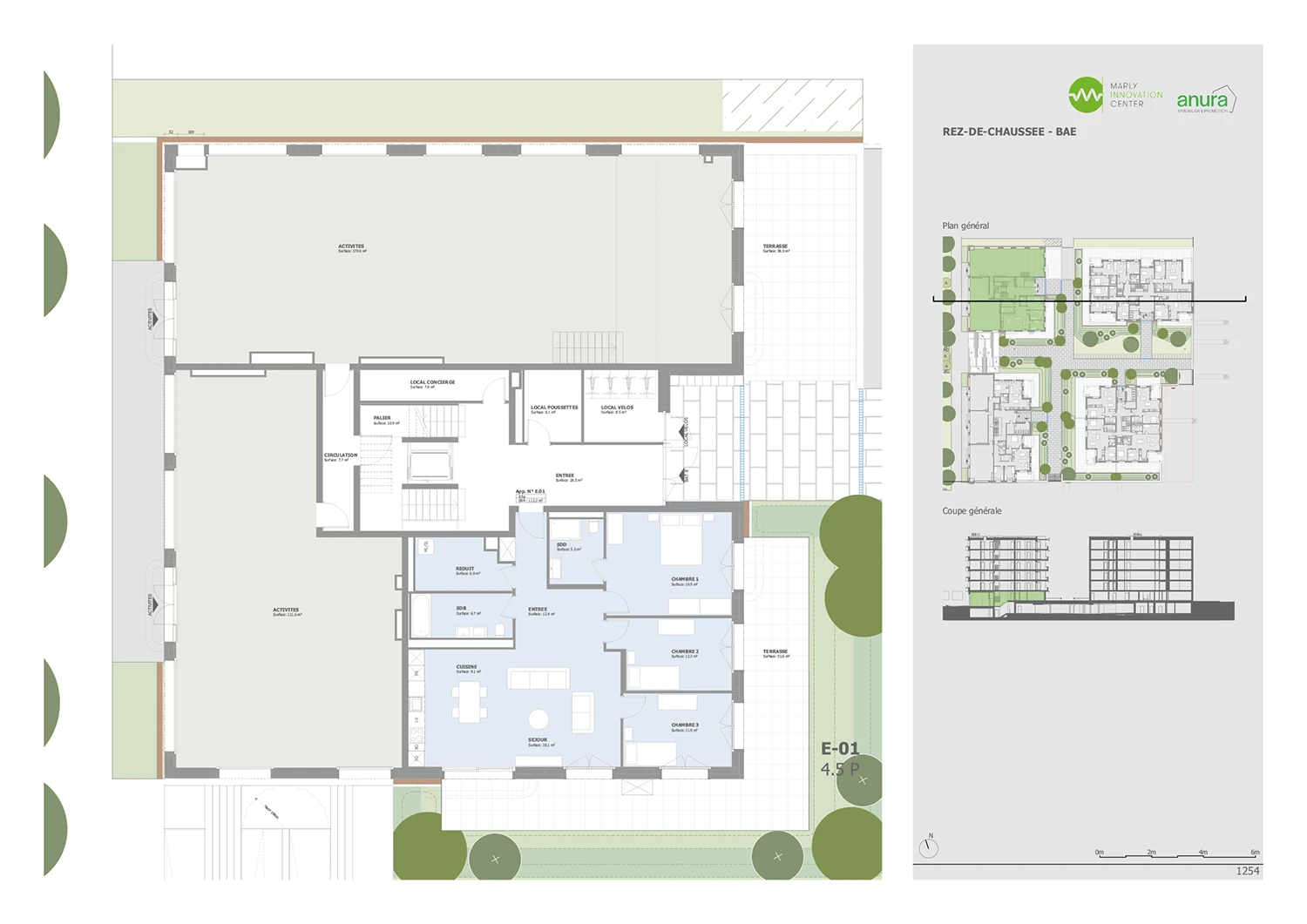 Plusieurs surfaces d'activités sont réparties au rez des immeubles E (281m2) et F (228m2).